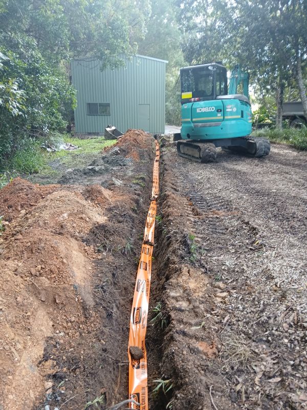 Running underground sub-mains involves the installation of mechanically protected cabling through conduit, which must be trenched at the correct depth and backfilled appropriately. On rural properties, this often necessitates collaboration with an earthworks contractor for the trenching process. The electrical connections at both ends, including those at the main switchboard and the shed sub-board, must be executed by licensed electrical professionals. We manage the entire process, overseeing earthworks, so you only need to communicate with one point of contact instead of juggling multiple trades, making the project more streamlined and efficient while ensuring quality and safety standards are met.